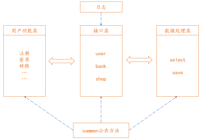 以登陆功能为例,用户输入了用户名和密码,调用登录的接口,登录的接口再调用select查询方法将查询结果返回给接口层,接口层进行一些判断,若成功,将返回True给用户功能层.