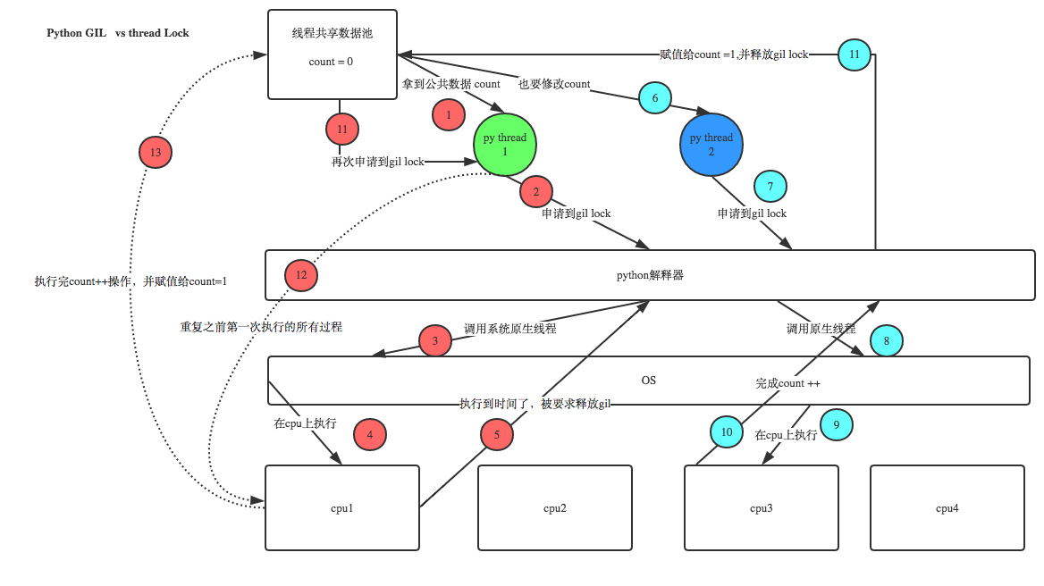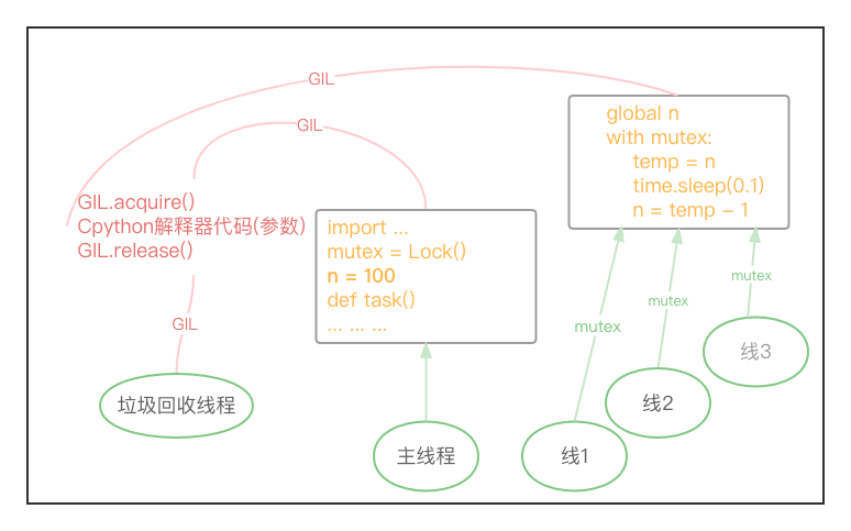 提醒一下: 解释器的代码是所有线程共享的,所以垃圾回收线程调用的也是python解释器的功能!!