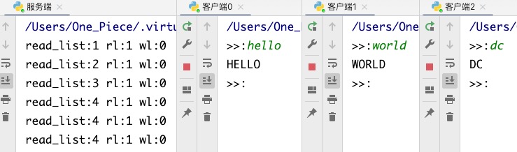 建立完链接后,客户端0-2依次向服务端发消息.. 结果如下: