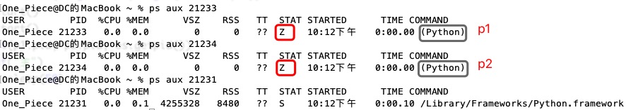 Ps: mac上显示的结果..不是很通俗易懂. 以后的程序都在Linux上运行. linux上的运行实验结果,详见前面linux基础中"管理进程"章节中僵尸进程与孤儿进程中实验验证部分的内容!!!