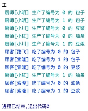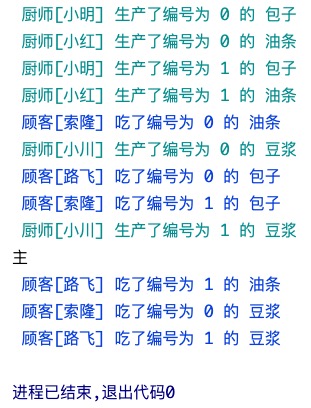 所以打印出的结果中,厨师先生产了编号为0,1的包子,顾客才吃完编号为1的包子! 侧面也说明了是并发执行的!